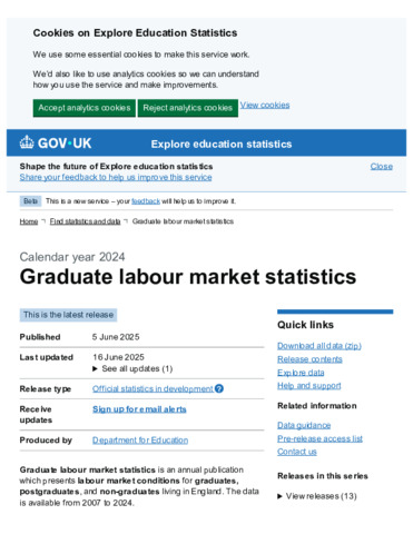 Graduate labour market statistics, Calendar year 2024 - Explore education statistics - GOV.UK.pdf - Published Version Available under License Open Government Licence. Download (458kB) | Preview |