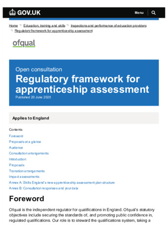 Regulatory framework for apprenticeship assessment - GOV.UK.pdf Volume/Part: Main document - Published Version Available under License Open Government Licence. Download (585kB) | Preview |