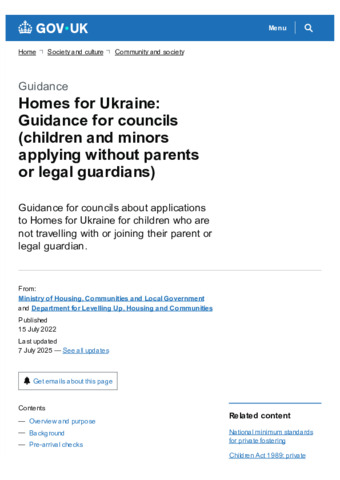 Homes for Ukraine : Guidance for councils (children and minors applying without parents or legal guardians) : Updated 7 July 2025.