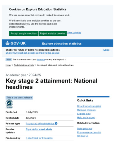 Key stage 2 attainment National headlines, Academic year 202425 - Explore education statistics - GOV.UK.pdf - Published Version Available under License Open Government Licence. Download (346kB) | Preview |