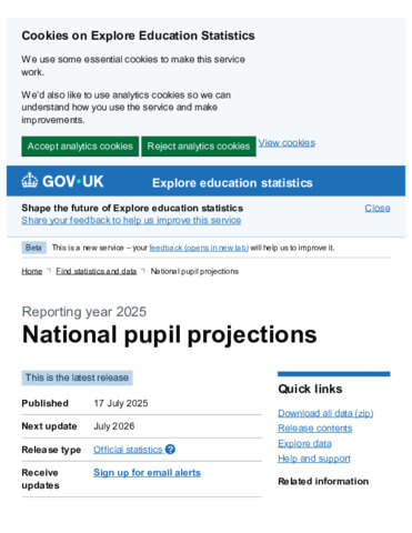 National pupil projections, Reporting year 2025 - Explore education statistics - GOV.UK.pdf - Published Version Available under License Open Government Licence. Download (165kB) | Preview |