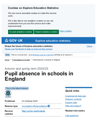 Pupil absence in schools in England, Autumn and spring term 202425 - Explore education statistics - GOV.UK.pdf - Published Version Available under License Open Government Licence. Download (424kB) | Preview |