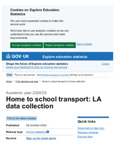 Home to school transport LA data collection, Academic year 202425 - Explore education statistics - GOV.UK.pdf - Published Version Available under License Open Government Licence. Download (206kB) | Preview |