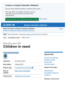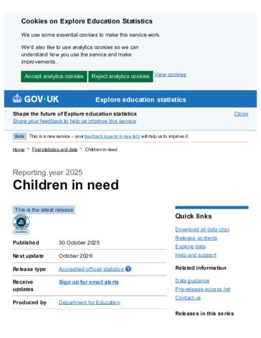 Children in need, Reporting year 2025 - Explore education statistics - GOV.UK.pdf - Published Version Available under License Open Government Licence. Download (391kB) | Preview |