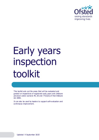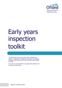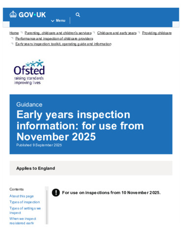 | Additional Information: | Some of these documents were converted from HTML format into PDF format and added to DERA on 3 December 2025. Due to formatting issues, some data may have been lost or truncated in the conversion process. Please refer to the publisher website if you wish to access the fully interactive version of the document. - Applies to England. - Early years inspection operating guide for inspectors / Early years inspection information: for use from November 2025. |