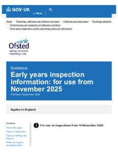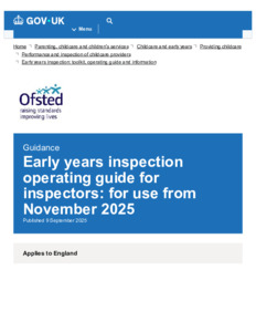 Early years inspection operating guide for inspectors for use from November 2025 - GOV.UK.pdf Volume/Part: Operating guide for inspectors - Published Version Available under License Open Government Licence. Download (535kB) | Preview |