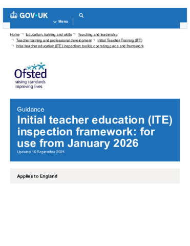 Initial teacher education (ITE) inspection framework for use from January 2026 - GOV.UK.pdf Volume/Part: Inspection framework - Published Version Available under License Open Government Licence. Download (183kB) | Preview |