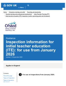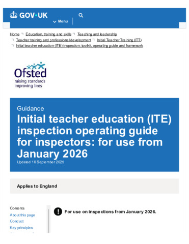 Initial teacher education (ITE) inspection operating guide for inspectors for use from January 2026 - GOV.UK.pdf Volume/Part: Inspection operating guide - Published Version Available under License Open Government Licence. Download (517kB) | Preview |