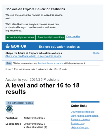 A level and other 16 to 18 results : Academic year 2024/25 Provisional : Last updated 20 November 2025.