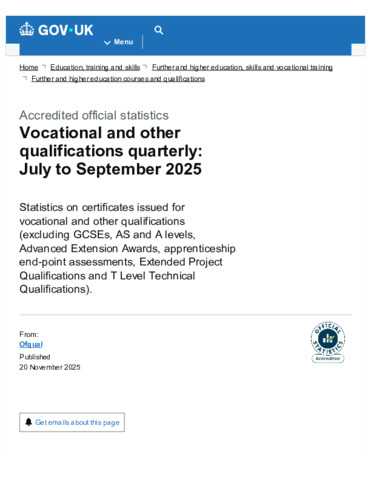 Vocational and other qualifications quarterly : July to September 2025 : Published 20 November 2025.