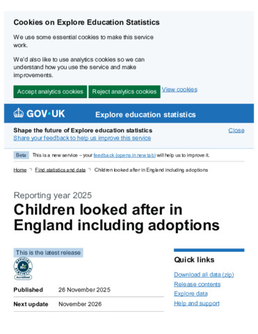 Children looked after in England including adoptions, Reporting year 2025 - Explore education statistics - GOV.UK.pdf - Published Version Available under License Open Government Licence. Download (451kB) | Preview |