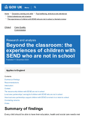 Beyond the classroom - the experiences of children with SEND who are not in school - GOV.UK.pdf - Published Version Available under License Permission Granted by Copyright Owner. Download (481kB) | Preview |