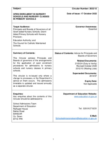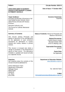 ED1 22 258973 DE Circular 2022 12 - Open Enrolment in Nursery Schools and Nursery Classes in Primary Schools(.pdf Volume/Part: 2022/12 - Published Version Available under License Open Government Licence. Download (330kB) | Preview |