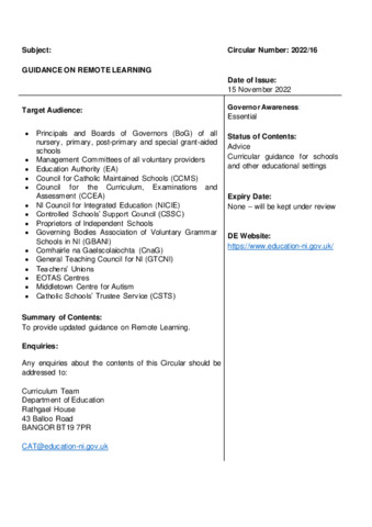 Circular 2022 16 - Remote Learning.pdf Volume/Part: 2022/16 - Published Version Available under License Open Government Licence. Download (134kB) | Preview |