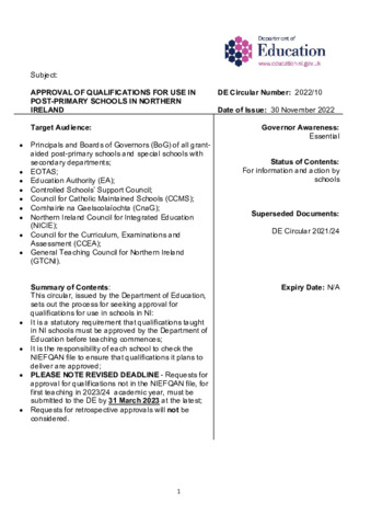 CIRCULAR 2022.10 APPROVAL OF QUALIFICATIONS FOR USE IN POST PRIMARY SCHOOLS IN NORTHERN IRELAND.pdf Volume/Part: 2022/10 - Published Version Available under License Open Government Licence. Download (518kB) | Preview |