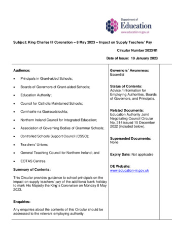 DE Circular Number 2023 01 King Charles III Coronation - 8 May 2023 - Impact on Supply Temporary Teachers .pdf Volume/Part: 2023/01 - Published Version Available under License Open Government Licence. Download (153kB) | Preview |