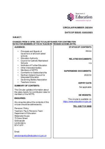 Changes from 01 April 2023 to Salary Bands for Contribution Rates for Members of the NI Teachers' Pension Scheme (NITPS).