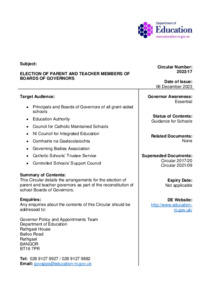 CIRCULAR 2023-17 ELECTION OF PARENT AND TEACHER MEMBERS OF BOARDS OF GOVERNORS.pdf Volume/Part: 2023/17 - Published Version Available under License Open Government Licence. Download (116kB) | Preview |