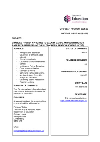 Changes from 01 April 2025 to Salary Bands and Contribution Rates for Members of the NI Teachers' Pension Scheme (NITPS).
