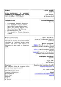 Circular 2025 11 Open Enrolment in Nursery Primary, Post Primary and Senior High Schools ~ 2026 27.pdf Volume/Part: 2025/11 - Published Version Available under License Open Government Licence. Download (292kB) | Preview |