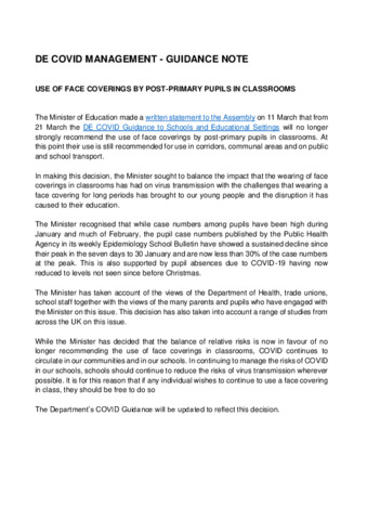 DE Covid Management : Guidance Notes : Use of Face Coverings by Post-Primary pupils in classrooms.