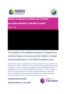 Revised - Annual enrolments at schools and in funded pre-school education in Northern Ireland - 2023-24.pdf - Published Version Restricted to Repository staff only Available under License Open Government Licence. Download (513kB) |