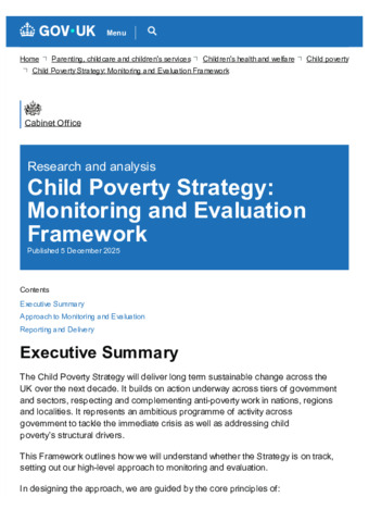 Child Poverty Strategy Monitoring and Evaluation Framework - GOV.UK.pdf - Published Version Available under License Open Government Licence. Download (310kB) | Preview |