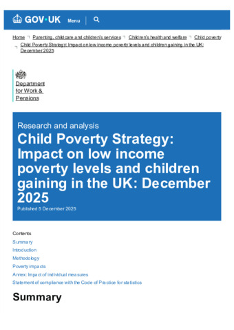Child Poverty Strategy Impact on low income poverty levels and children gaining in the UK December 2025 - GOV.UK.pdf - Published Version Available under License Open Government Licence. Download (311kB) | Preview |