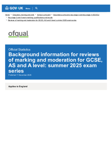 Background info for reviews of marking and moderation summer 2025 exam series - GOV.UK.pdf Volume/Part: Background information - Published Version Available under License Open Government Licence. Download (250kB) | Preview |