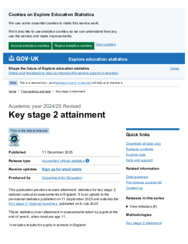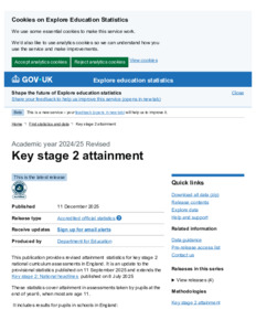 Key stage 2 attainment, Academic year 202425 Revised - Explore education statistics - GOV.UK.pdf - Published Version Available under License Open Government Licence. Download (324kB) | Preview |