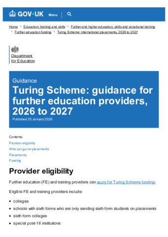 Turing scheme guidance for further education providers, 2026 to 2027 - GOV.UK.pdf Volume/Part: Guidance for further education providers - Published Version Available under License Open Government Licence. Download (258kB) | Preview |