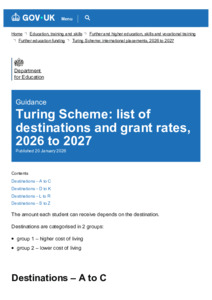 Turing scheme list of destinations and grant rates, 2026 to 2027 - GOV.UK.pdf Volume/Part: List of destinations and grant rates - Published Version Available under License Open Government Licence. Download (182kB) | Preview |