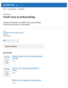 Youth voice in policymaking - GOV.UK.pdf Volume/Part: Youth voice in policymaking - Published Version Available under License Open Government Licence. Download (173kB) | Preview |
