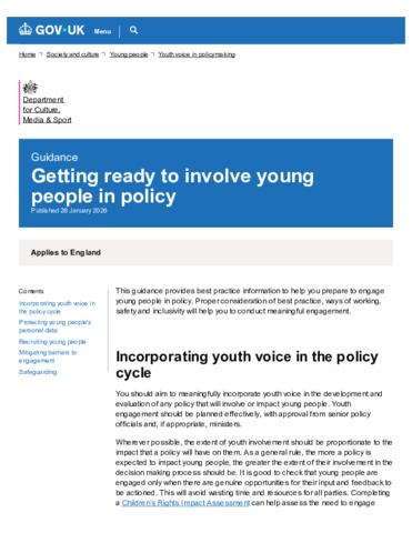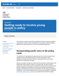Getting ready to involve young people in policy - GOV.UK.pdf Volume/Part: Getting ready to involve young people in policy - Published Version Available under License Open Government Licence. Download (232kB) | Preview |