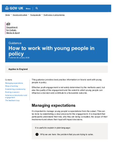 How to work with young people in policy - GOV.UK.pdf Volume/Part: How to work with young people in policy - Published Version Available under License Open Government Licence. Download (224kB) | Preview |