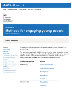 Methods for engaging young people - GOV.UK.pdf Volume/Part: Methods for engaging young people - Published Version Available under License Open Government Licence. Download (256kB) | Preview |
