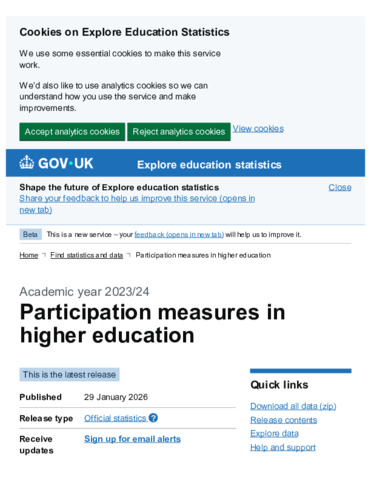 Participation measures in higher education, Academic year 202324 - Explore education statistics - GOV.UK.pdf - Published Version Available under License Open Government Licence. Download (340kB) | Preview |