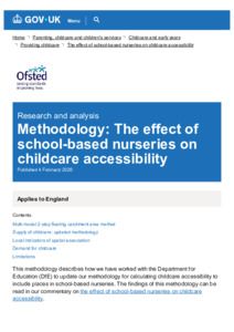 Methodology The effect of school-based nurseries on childcare accessibility - GOV.UK.pdf Volume/Part: Methodology - Published Version Available under License Open Government Licence. Download (336kB) | Preview |