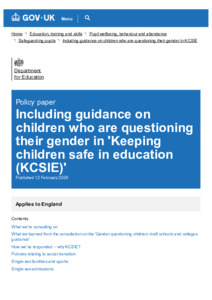 Including guidance on children who are questioning their gender in 'Keeping children safe in education (KCSIE)' - GOV.UK.pdf - Published Version Available under License Open Government Licence. Download (209kB) | Preview |