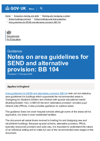 Notes on area guidelines for SEND and alternative provision BB 104 - GOV.UK.pdf Volume/Part: Notes on area guidelines BB 104 - Published Version Available under License Open Government Licence. Download (141kB) | Preview |