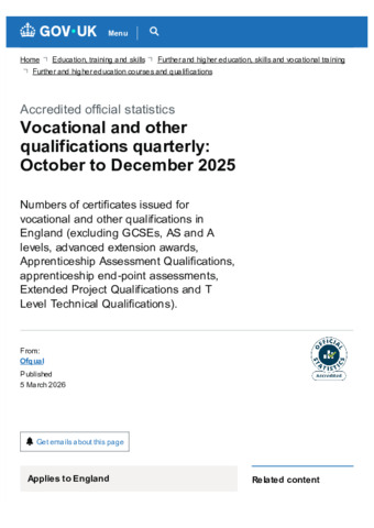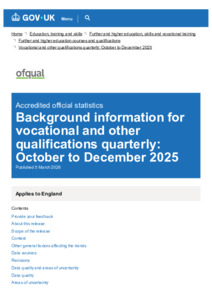Background information for vocational and other qualifications quarterly October to December 2025 - GOV.UK.pdf Volume/Part: Background information - Published Version Available under License Open Government Licence. Download (281kB) | Preview |