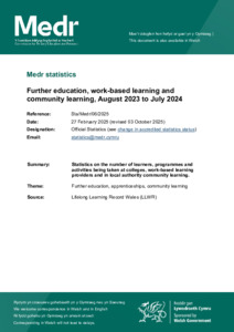 | Additional Information: | Ystadegau Medr : Addysg bellach, dysgu seiliedig ar waith a dysgu cymunedol, Awst 2023 i Orffennaf 2024. |