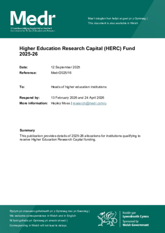 M2025_16-Higher-Education-Research-Capital-Funding-Publication-2025-26-Cymraeg.pdf Volume/Part: Welsh language - Published Version Available under License Open Government Licence. Download (234kB) | Preview |