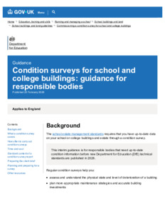 Condition surveys for school and college buildings guidance for responsible bodies - GOV.UK.pdf - Published Version Available under License Open Government Licence. Download (223kB) | Preview |