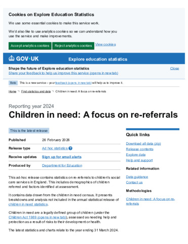 Children in need A focus on re-referrals, Reporting year 2024 - Explore education statistics - GOV.UK.pdf - Published Version Available under License Open Government Licence. Download (446kB) | Preview |