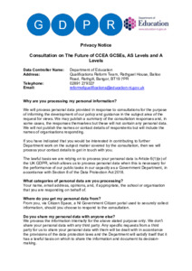DE Privacy Notice - Consultation on The Future of CCEA GCSEs AS Levels and A Levels.pdf Volume/Part: Privacy notice - Published Version Available under License Open Government Licence. Download (168kB) | Preview |