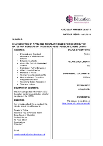 Changes from 01 April 2026 to Salary Bands for contribution rates for members of the NI Teacher's Pension Scheme (NITPS).