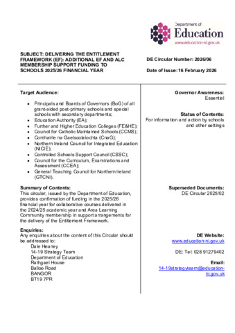 DE Circular 2026-06 Delivering the Entitlement Frame Work and ALC Membership support funding to schools 2025-0.pdf - Published Version Available under License Open Government Licence. Download (399kB) | Preview |