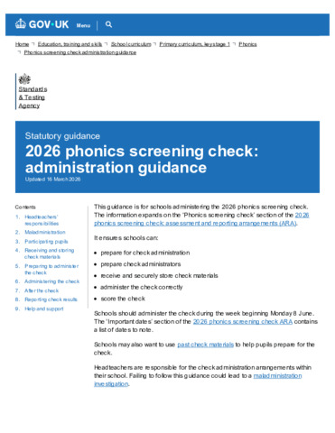 2026 phonics screening check : administration guidance : Updated 16 March 2026.